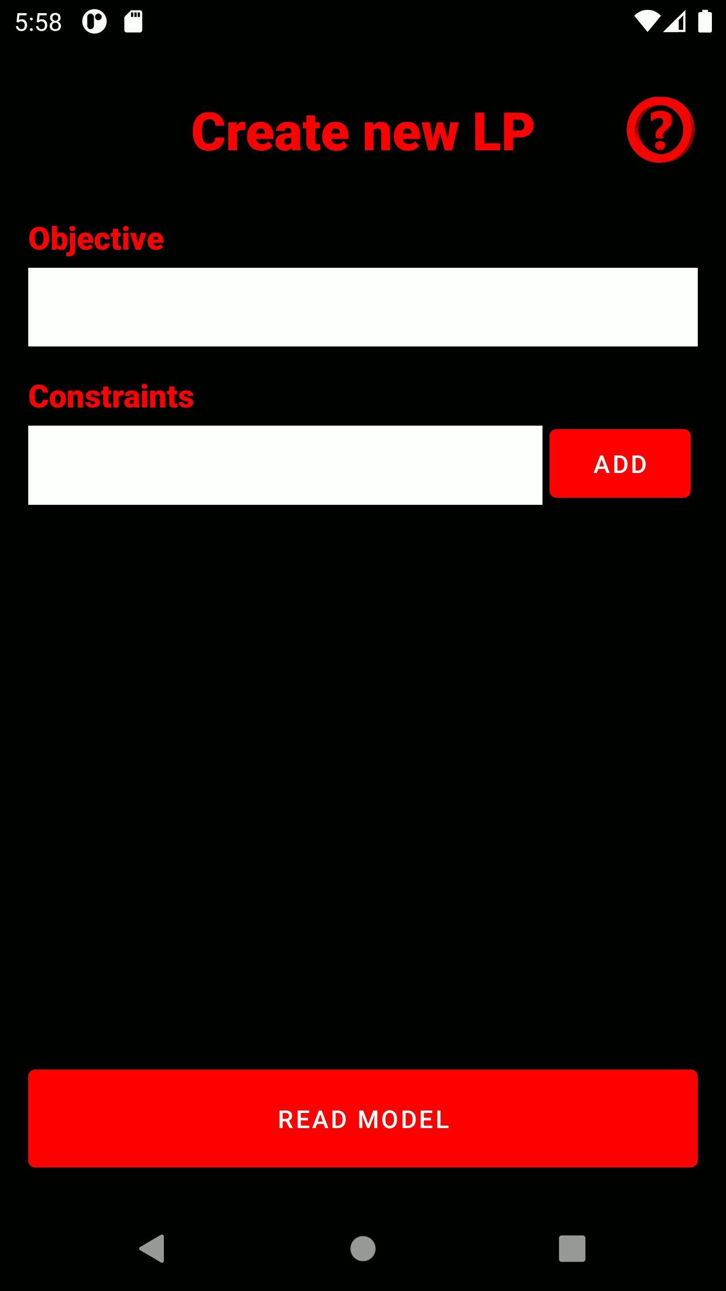 2. Type in your objective and all constraints. As soon as you click on the text field, a keyboard tailored to the input type appears. Constraints can be added to the model after input using the "ADD" button and appear below the input field. Incorrectly entered constraints can be deleted using the adjacent "REMOVE" button. The model is read in using the "READ" button.