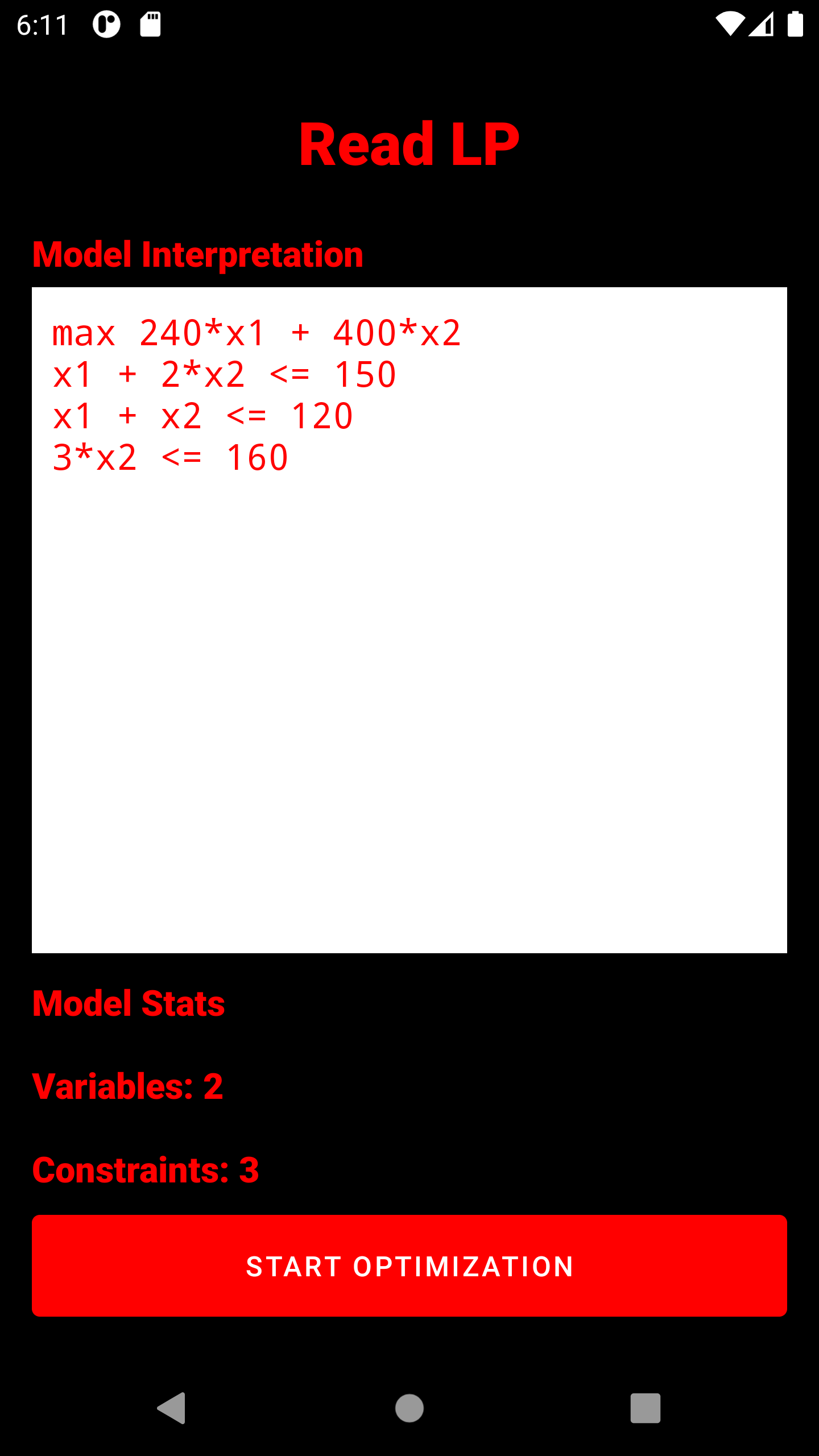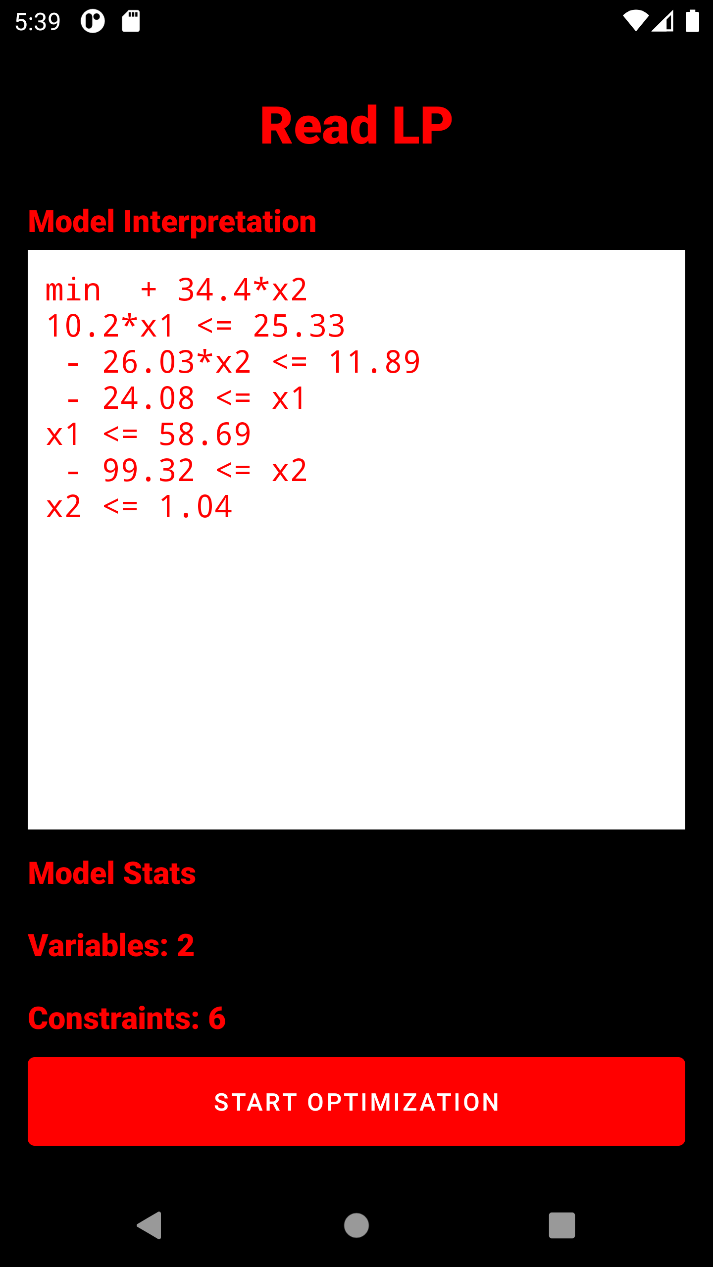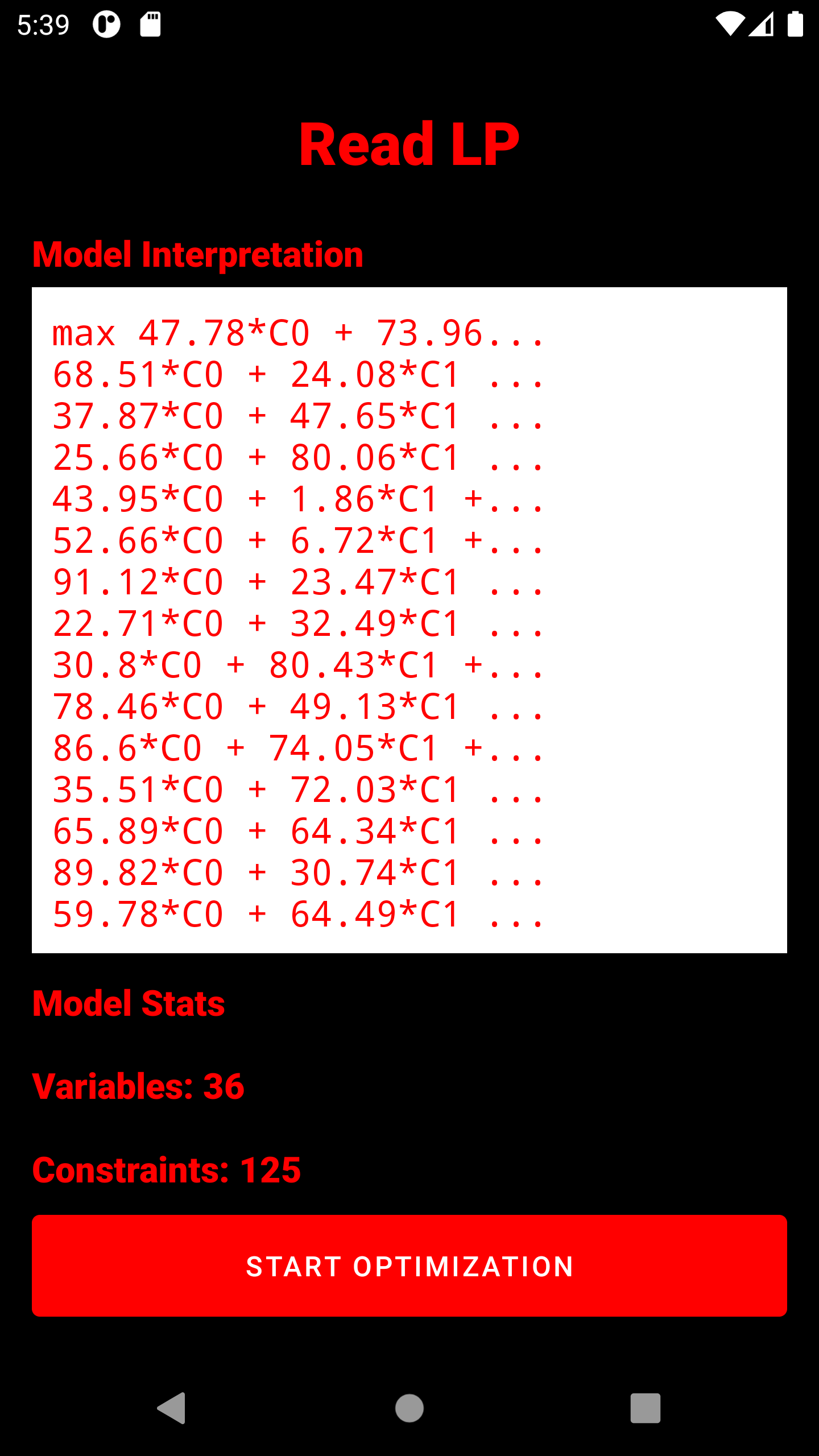 3. The entire captured model is displayed here. It has already passed a read test and can be optimized. Below the model, the number of variables (without slack) and constraints is displayed. IMPORTANT: All variables are strictly positive, unless they have been explicitly bounded with a negative number (Example: