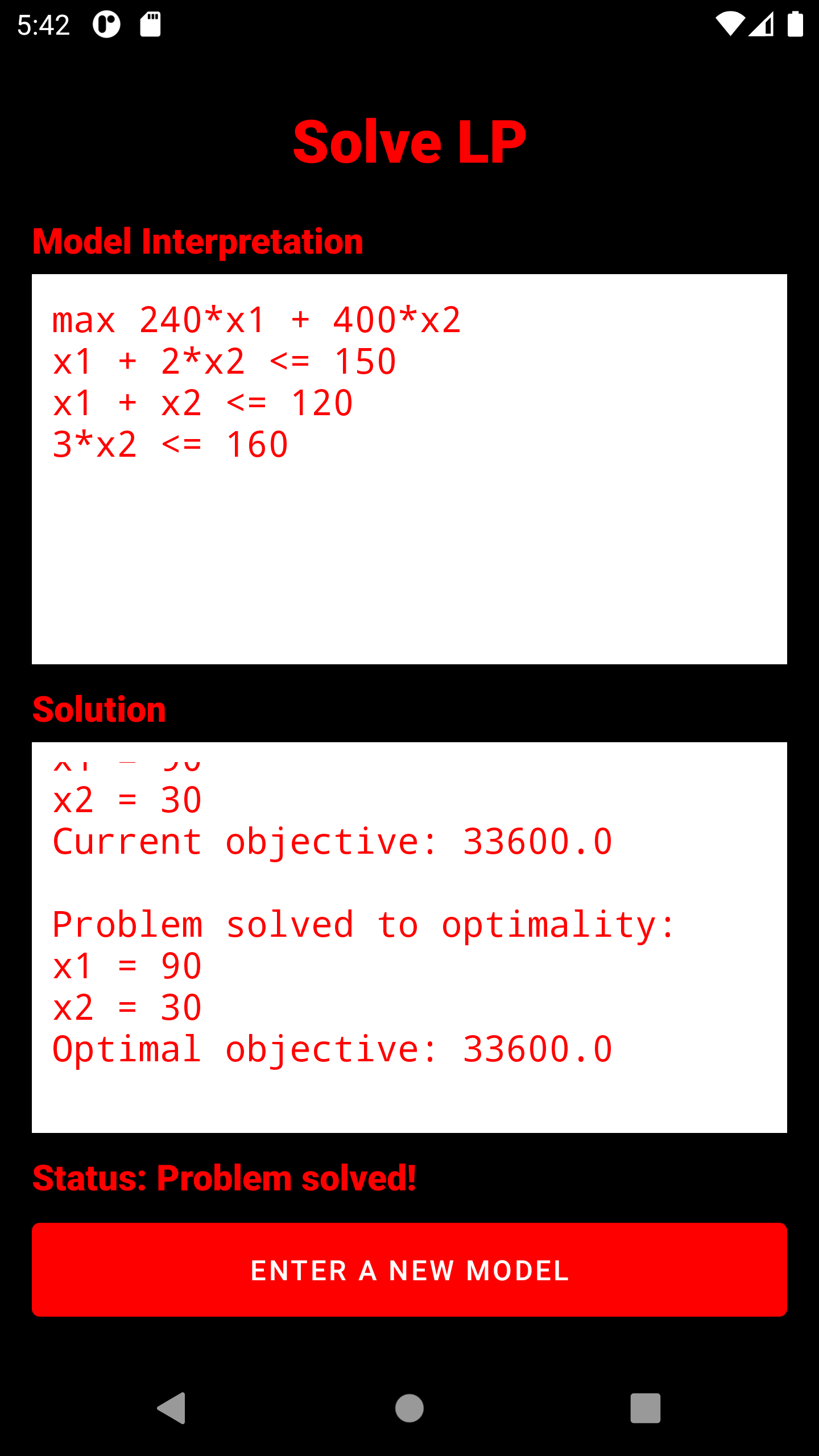 The LP solver can be used to enter your own models. For this the model can be entered user-friendly without being restricted by syntax. To make the input as simple as possible, an own keyboard was implemented, which contains the most important necessary character sets. Thus, any number of constraints can be entered and added. In case of typing errors, these can also be removed and added again. If syntactical errors occur, you will be informed in a message and can easily correct the input. Afterwards, the entered model can be viewed completely and then solved.