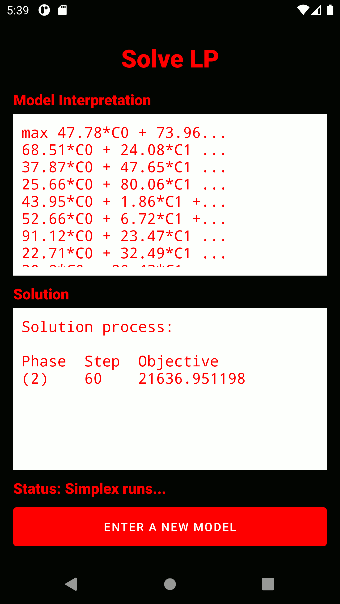 4. The simplex algrithm is triggered. The solution process will be displayed in detail. In any case, the optimal solution (if any) is displayed in the form of all variable assignments and the objective function value. The status display below the solution window indicates whether the problem is being processed, is infeasible, is unbounded, or is feasible.