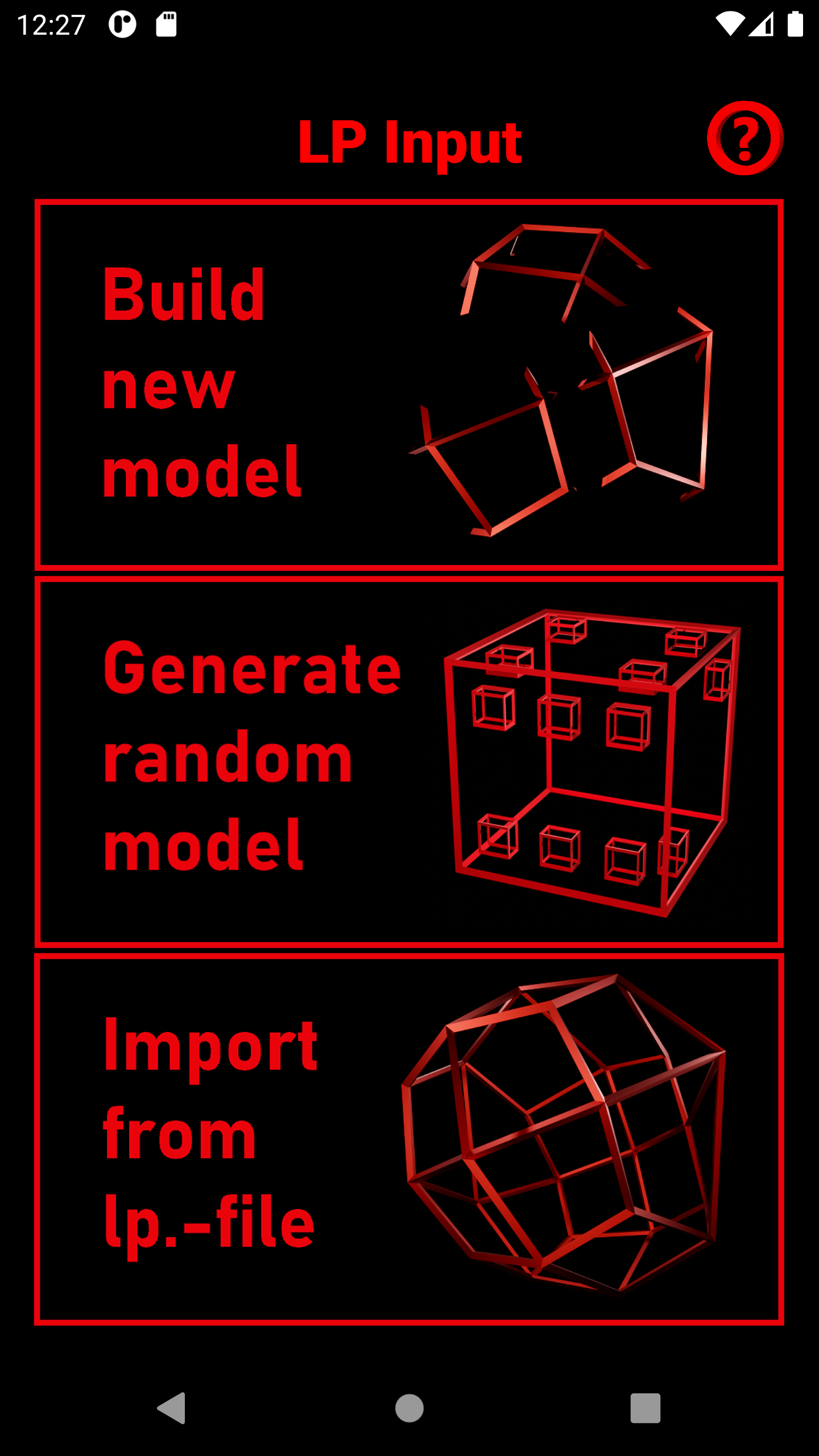 A window will open where you can select a file from your phone memory or external memory. Only files with the extension ".lp" are accepted. IMPORTANT: The LP file conventions apply. All coefficients must have been precalculated in this format and coefficients must be separated from variable by a space. In addition, the file needs an "END" tag.