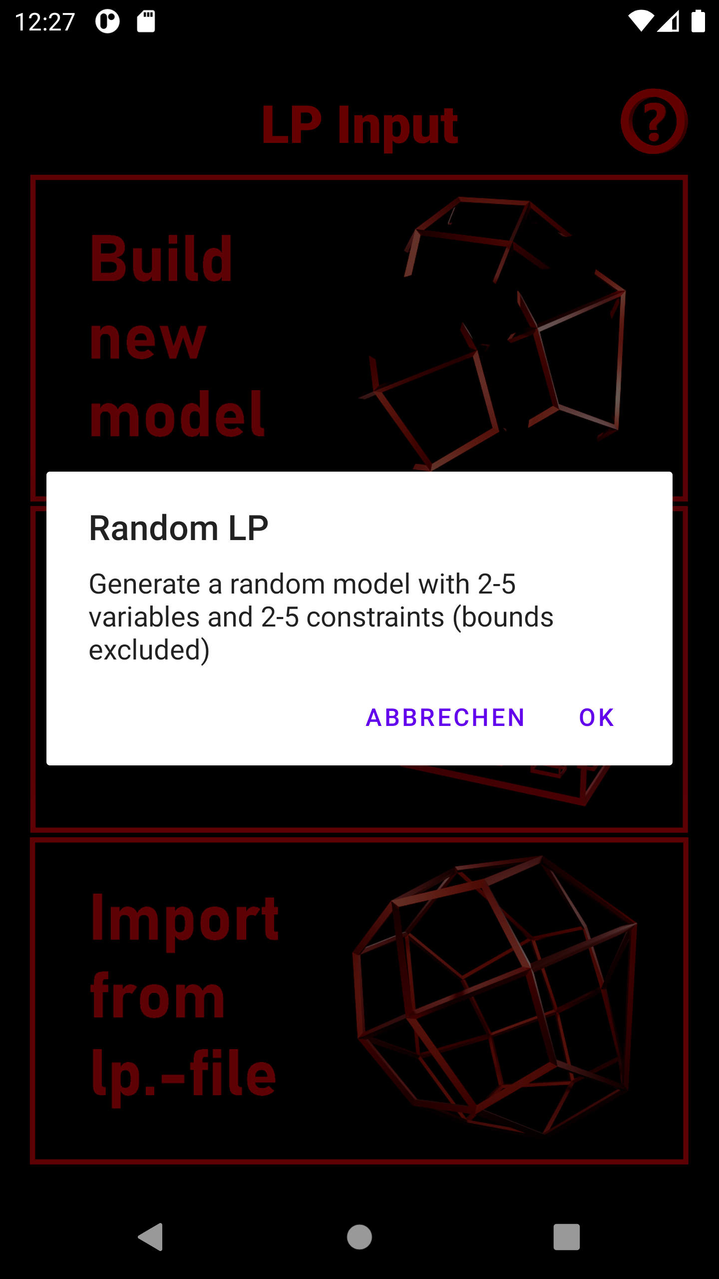 2. A pop-up-window will inform you, that a random model with 2-5 variables and constraints will be build. These random models are designed to be feasible. Generate the random model by pressing "OK". You have also the possibility to cancel the process.