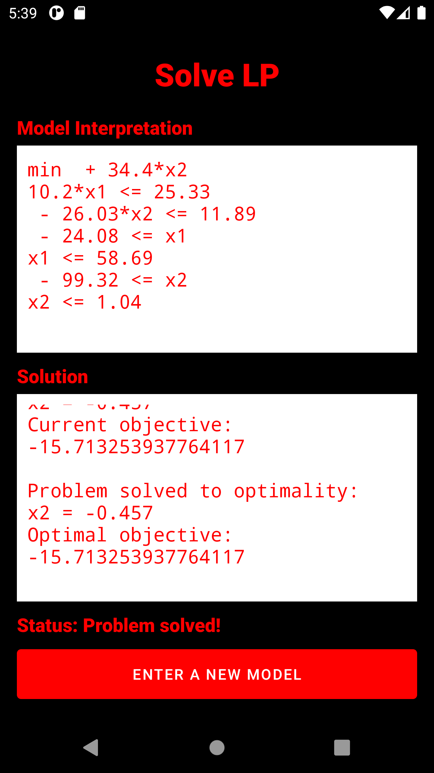 4. The simplex algrithm is triggered. Depending on the problem size, the display of the solution process varies. In any case, the optimal solution (if any) is displayed in the form of all variable assignments and the objective function value. The status display below the solution window indicates whether the problem is being processed, is infeasible, is unbounded, or is feasible.